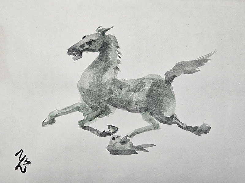 Week 2: Ancient Horses with Orchids: Capturing the texture and patina of bronze horse statues using ink and wash, contrasted with the elegance of orchids.