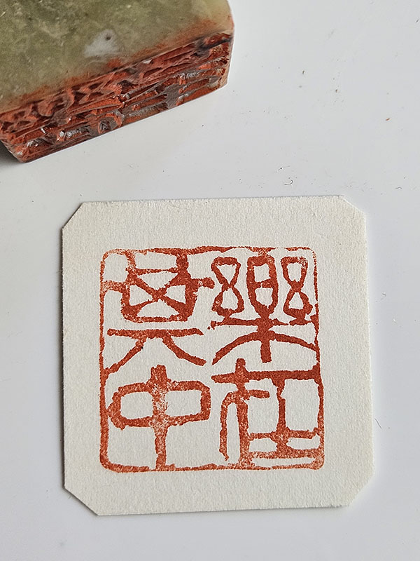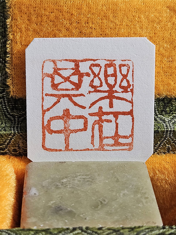 The content of this pre-carved mood seal is 樂在其中(Le Zai Qi Zhong), which means "Having Fun Doing it" It is a happy mood seal for your Chinese brush painting.